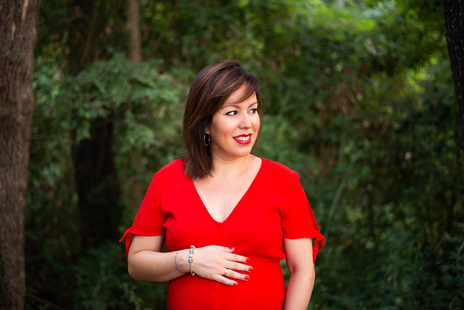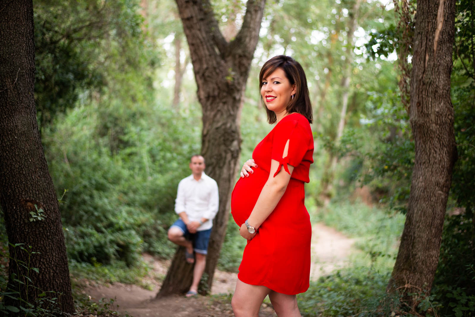 embarazada con vestido rojo en primer plano en el bosque al fondo el marido apoyado en árbol