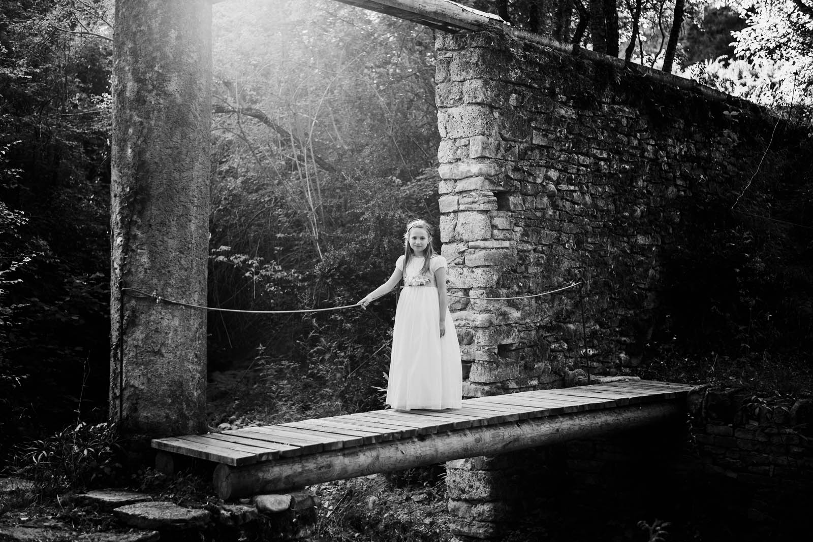 niña con vestido de comunión caminando por un sendero, se le ve de espaldas