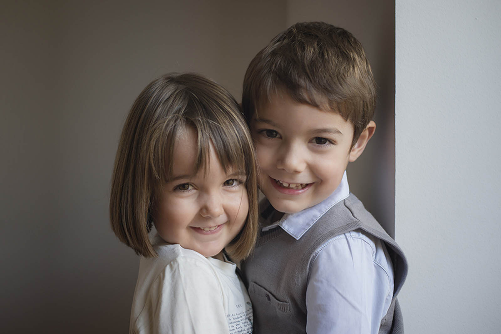 niños abrazados sonrientes, él mira a la cámara