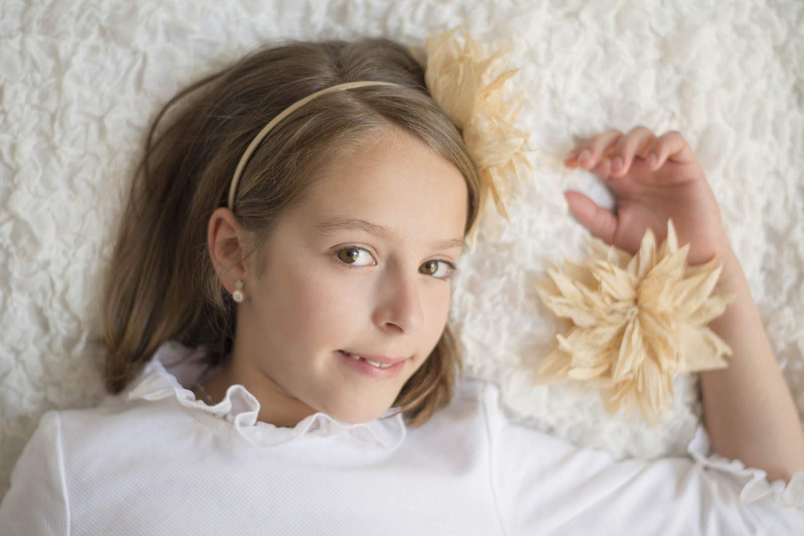 niña vestida de comunión tumbada en el suelo mirando a la cámara