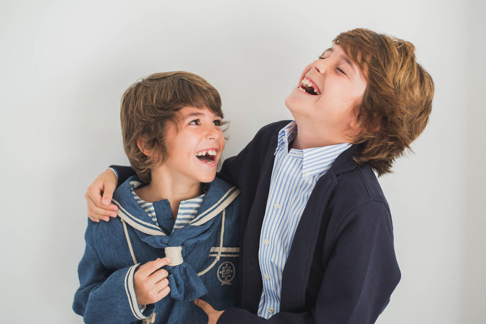 niño con camisa azul a rayas y pantalón azul mirando al suelo