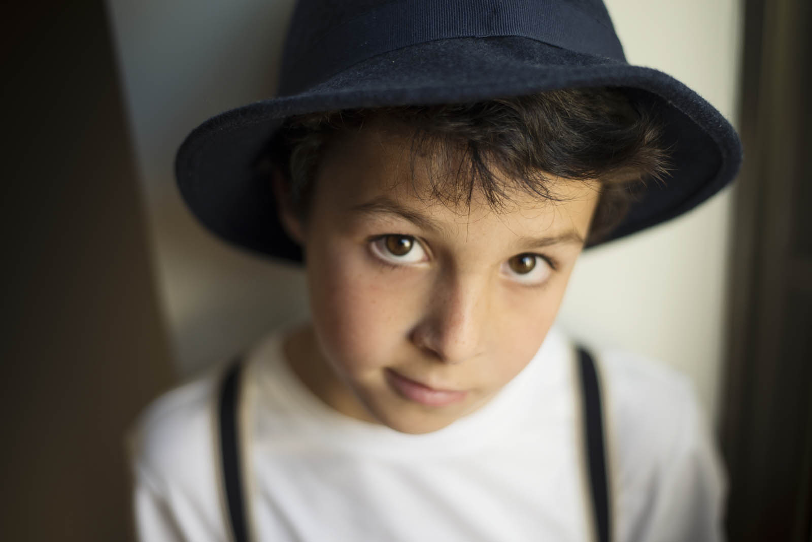 niño con sombrero azul apoyado en la pared y mirando a la cámara