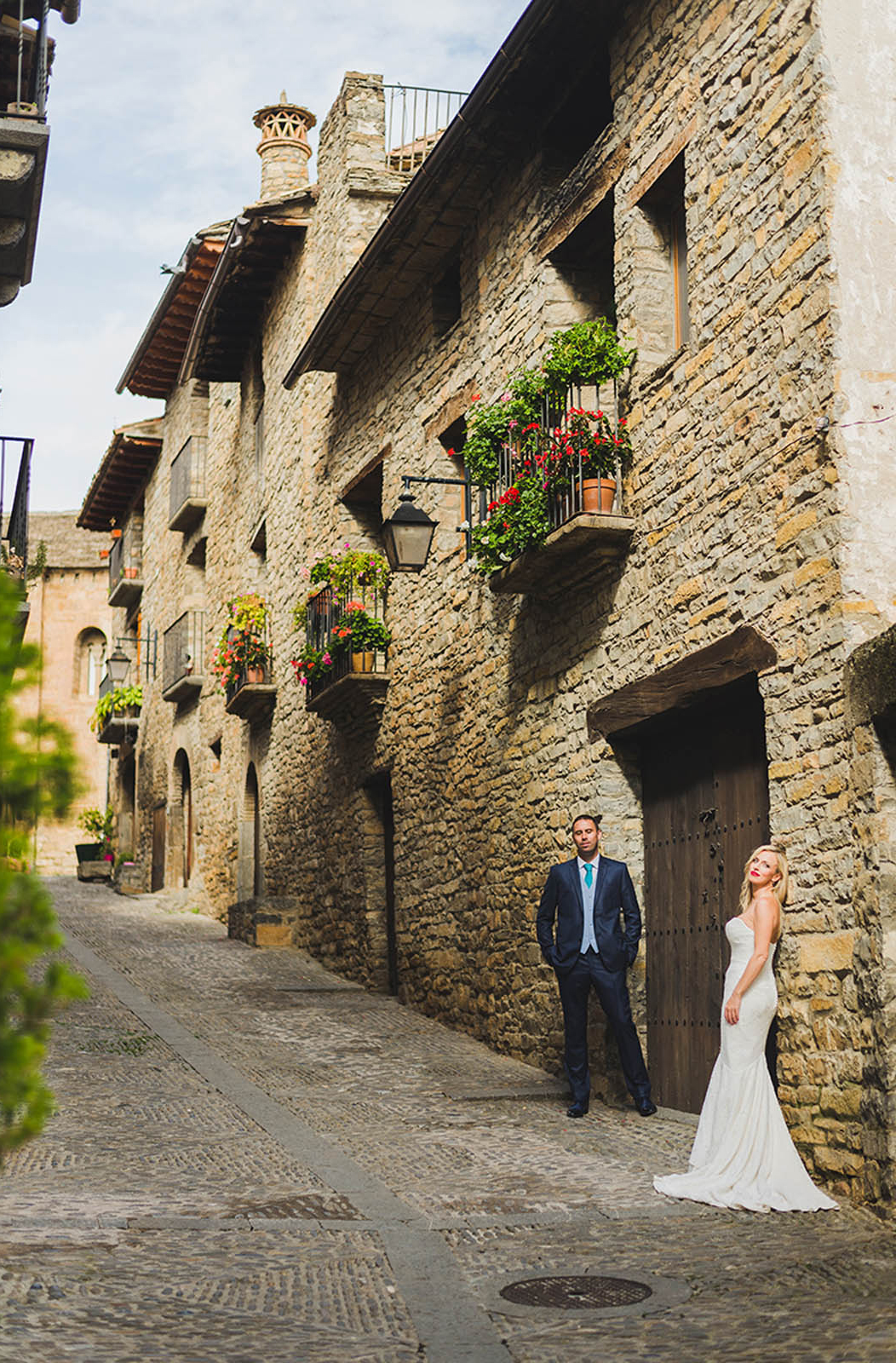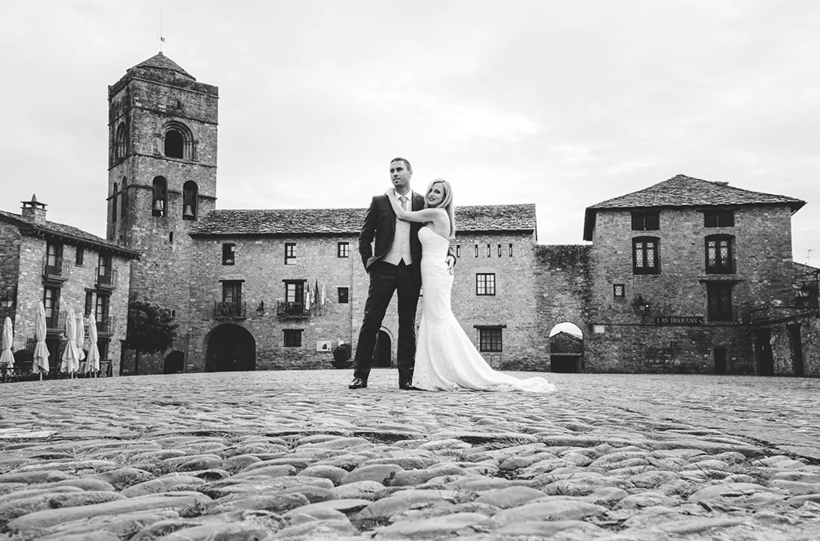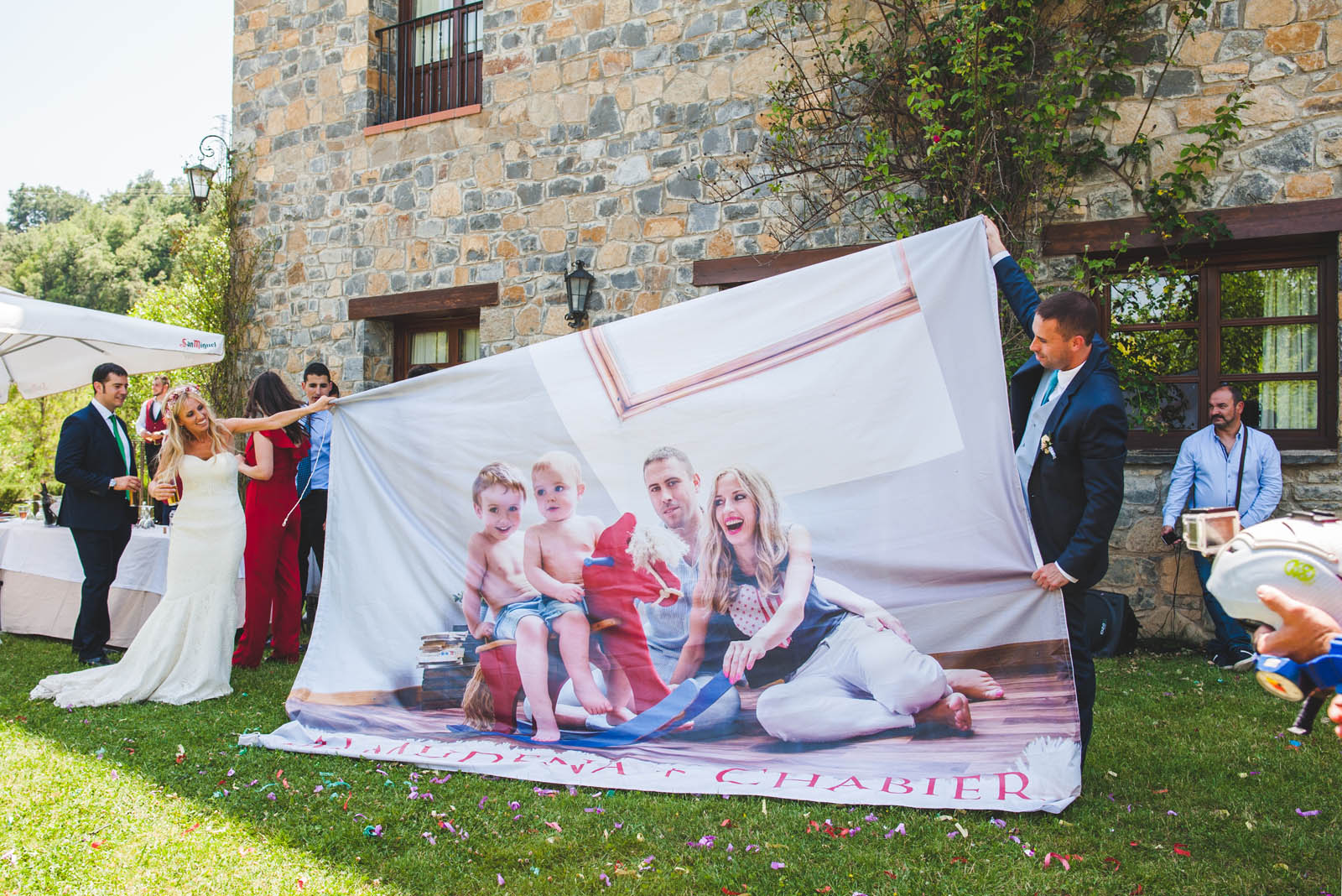 Novios descubriendo una pancarta de una foto de ellos con sus hijos